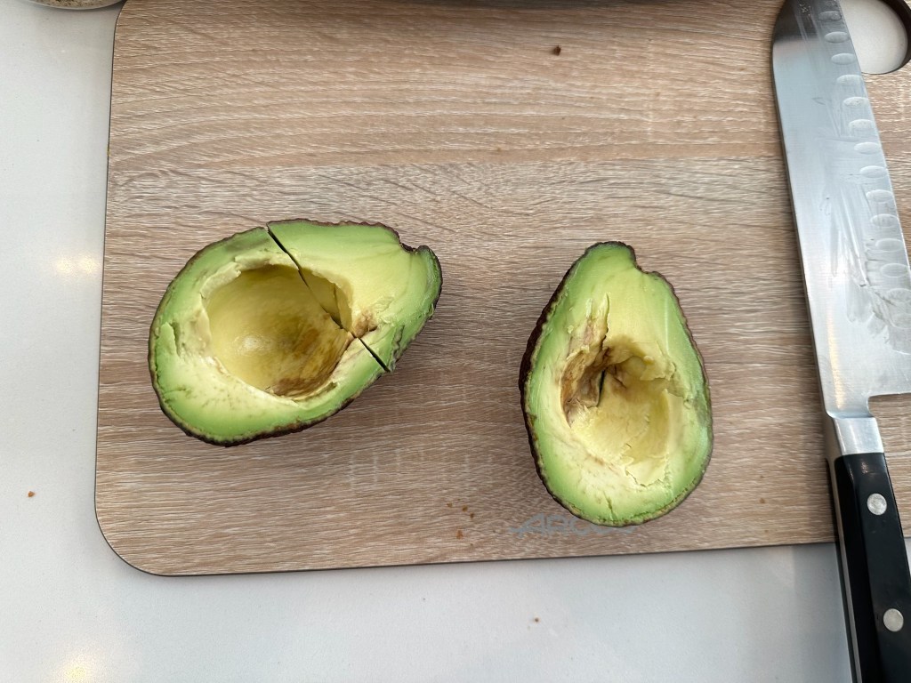 - Cut the avocado in half and carefully remove the pit, and scoop the flesh into a bowl.