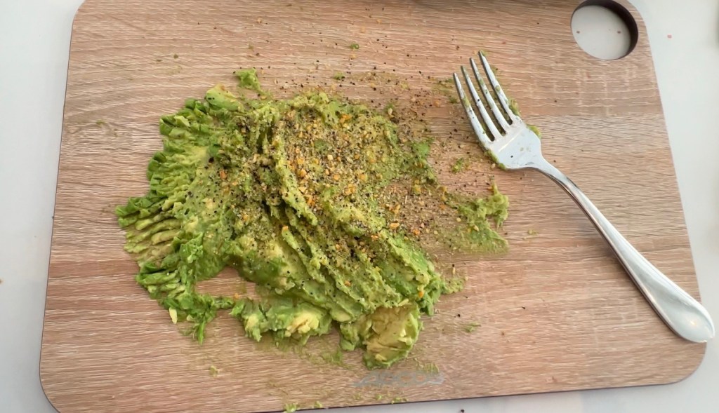 - Smush the avocado with a fork until smooth but a little chunky. Evenly spread over the toasted bread