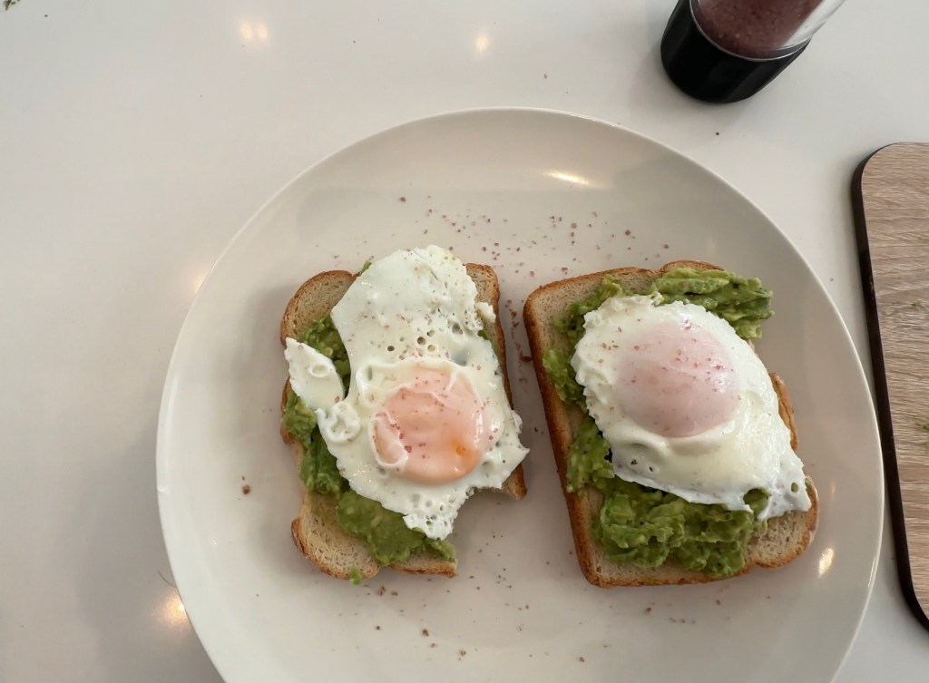 - Place one poached egg on top of each avocado-covered slice of toast.