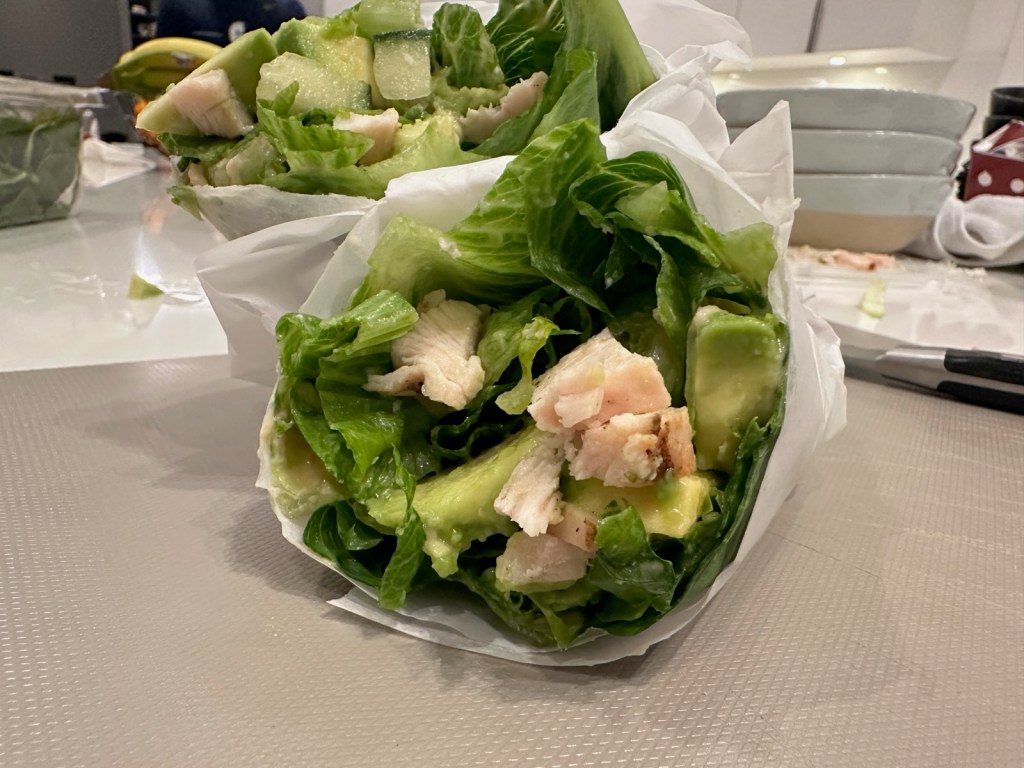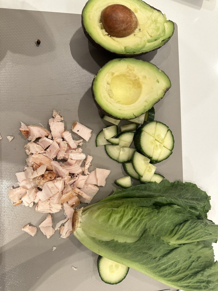 Slice your avocado, your cucumber, chicken and leftover lettuce and place in a jar or bin and shake gently (In this step I like to add some lemon for flavor)