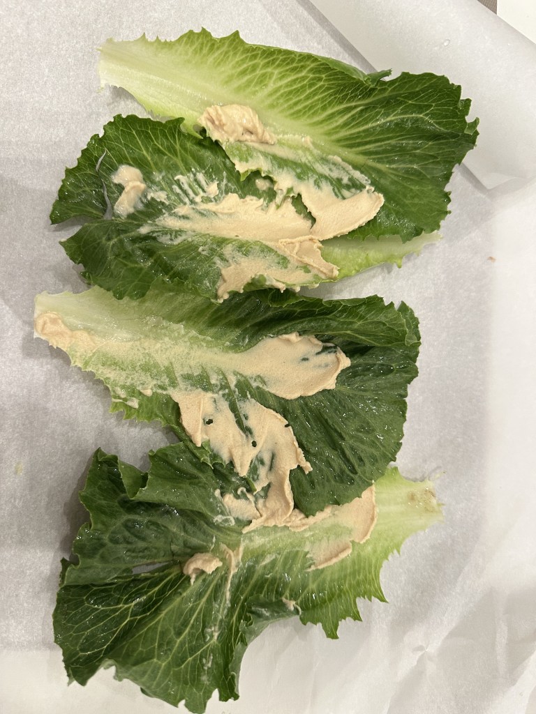 Take a lettuce leaf and sрread ½ tablespoon of hummus along its center.