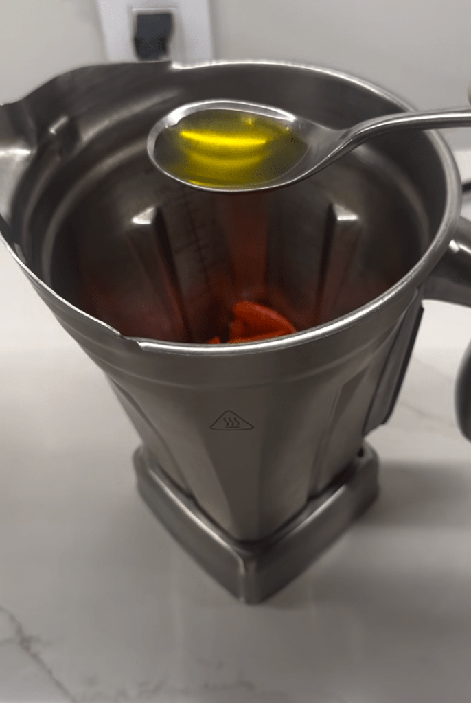 3. Place the 5 bottled pieces of roasted peppers or 1 and 1/3 of whole roasted peppers into the blender.